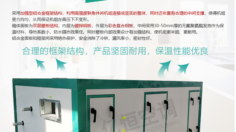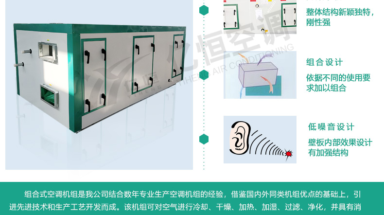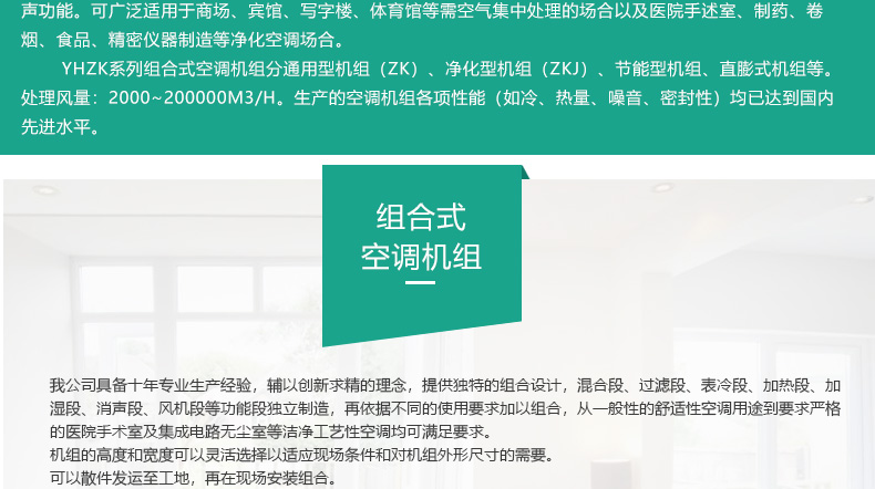组合式空调机组是我公司结合数年专业生产空调机组的经验,借鉴国内外同类机组优点的基础上,引进先进技术和生产工艺开发而成。该机组可对空气进行冷却、干燥、加热、加湿、过滤、净化,并具有消声功能。可广泛适用于商场、宾馆、写字楼、体育馆等需空气集中处理的场合以及医院手述室、制药、卷烟、食品、精密仪器制造等净化空调场合。